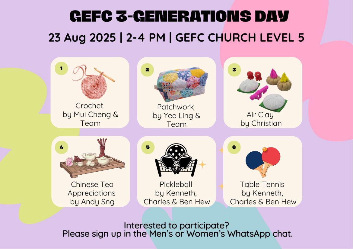 Date: 23/08/2025 Time: 2:00 PM - 4:00 PM If you are interested in joining these events. Please email our administrator at gefcadmin@geylangefc.org . Thank you .